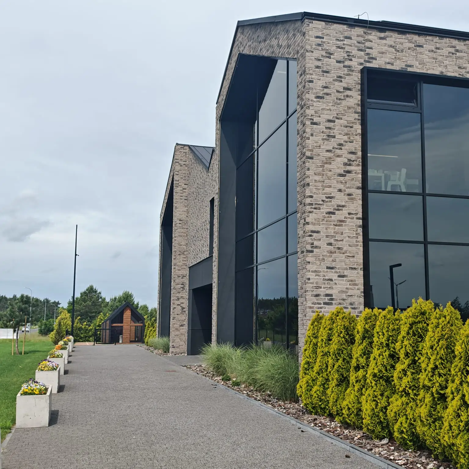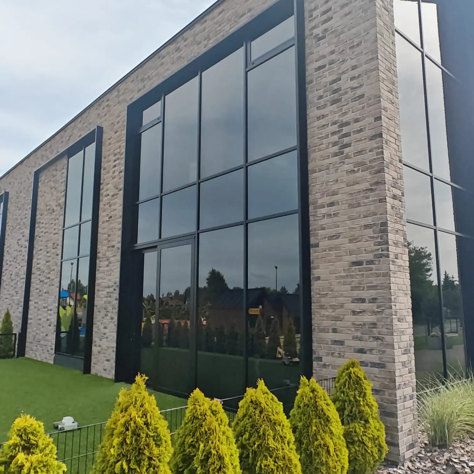 Nasza realizacja stolarki aluminiowej Bydgoszcz obejmowała 36 pozycji konstrukcyjnych o łącznej powierzchni 617,5 m² i obwodzie 645,8 m. Wszystkie konstrukcje aluminiowe Bydgoszcz zostały wykonane w eleganckim kolorze RAL 9005 (czarny mat), co nadaje budynkowi nowoczesny i reprezentacyjny charakter.