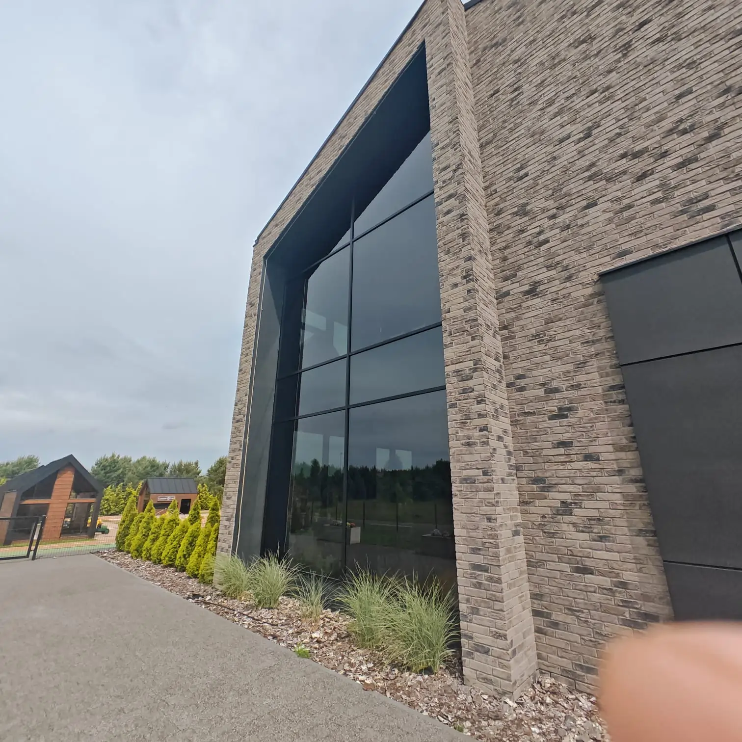 Szkło refleksyjne w kolorze grafitowym nie tylko zapewnia prywatność, ale również redukuje nagrzewanie pomieszczeń w okresie letnim, co przekłada się na oszczędności energetyczne.